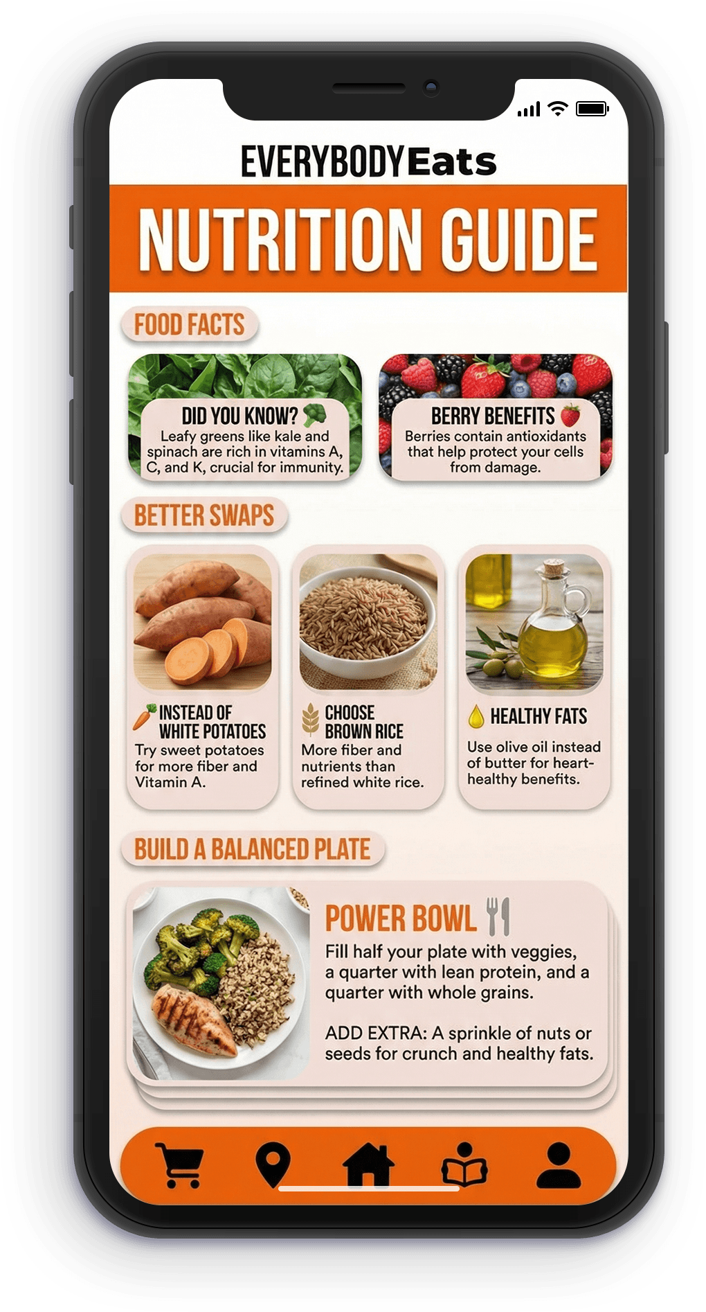 The Nutrition Curriculum helps residents better understand what healthy eating actually looks like. Inside the app, users can explore food facts, learn how to build balanced meals, and see healthier meal ideas based on the items they are already purchasing.