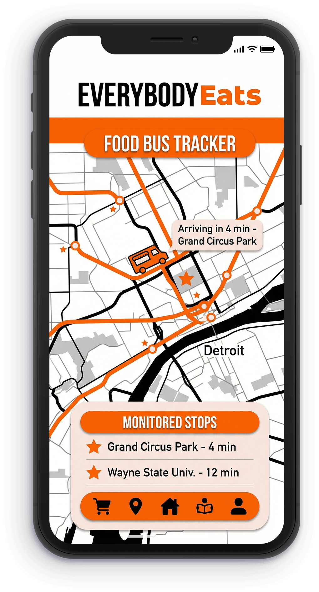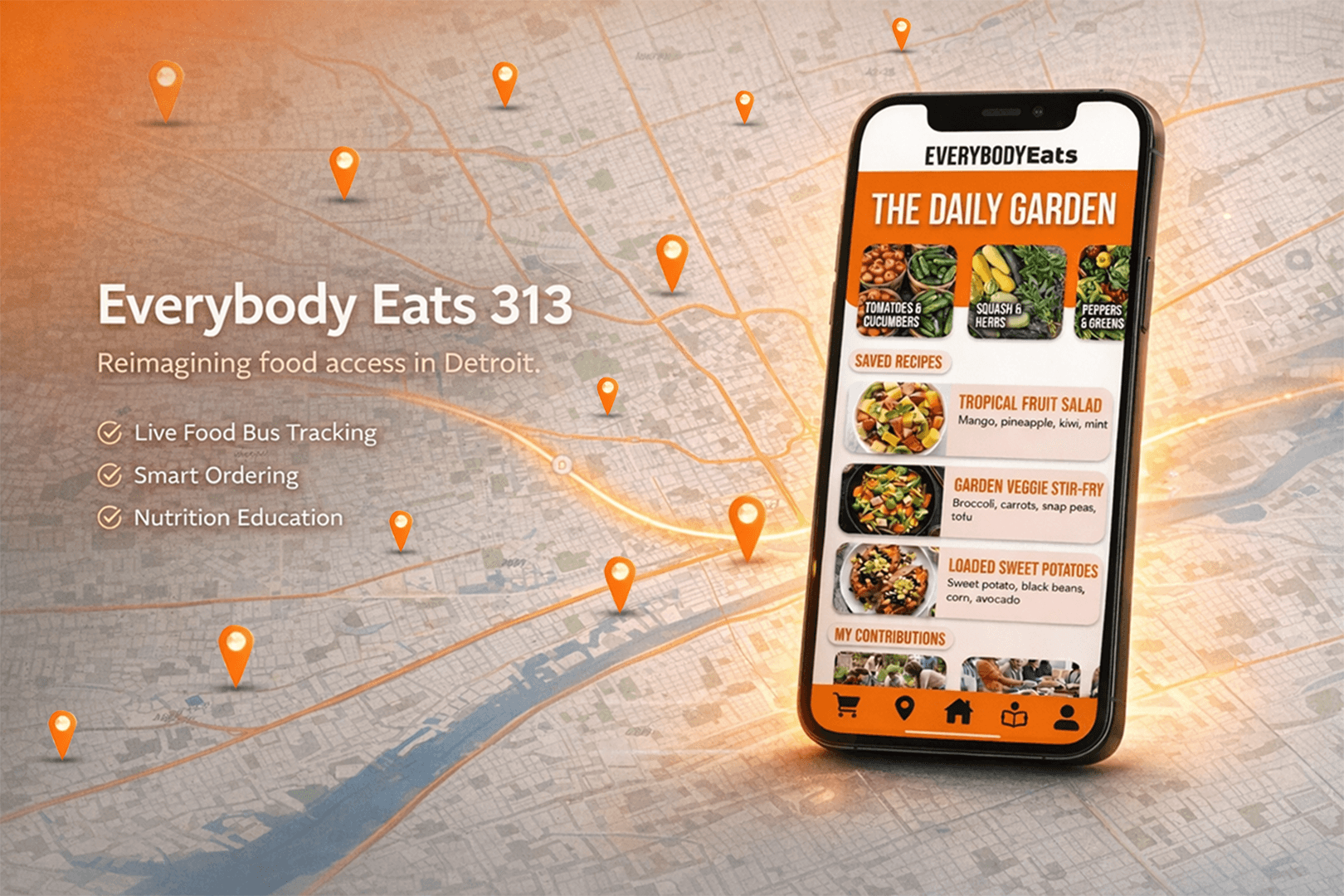 Everybody Eats 313 is a mobile platform designed to make healthy food more accessible in Detroit neighborhoods affected by food deserts. The app allows residents to track the location of a mobile food market in real time, place pickup orders for fresh groceries, and access simple educational tools that help them make healthier food choices.