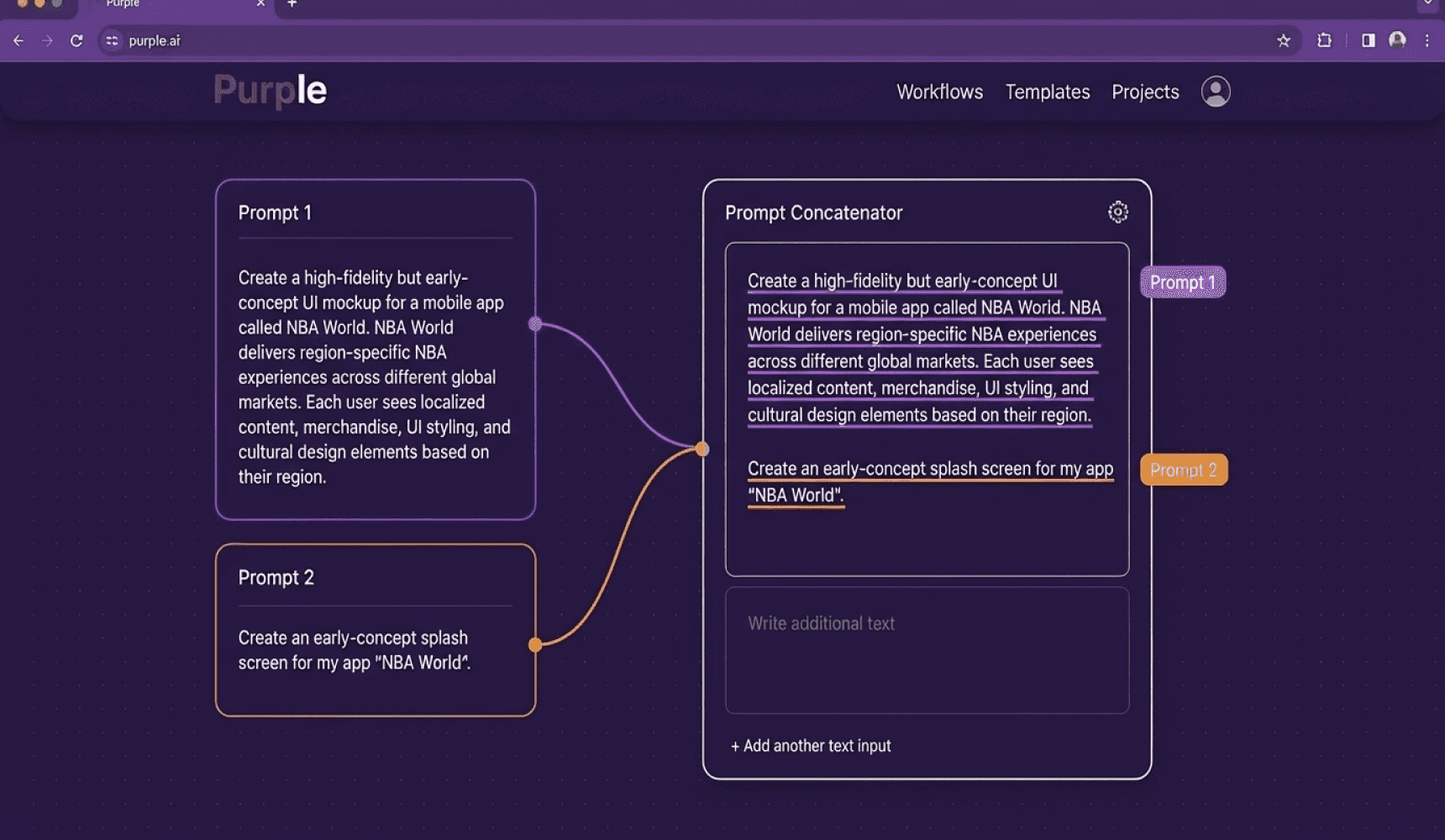 We experimented with ways to make our node workflows easier to read by labeling prompts within a prompt concatenator. We also studied how other tools approach AI workflow visualization to identify patterns that could improve clarity inside Purple.