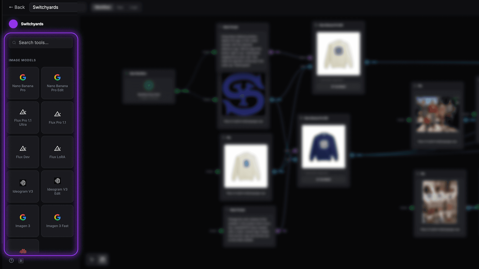 Access a Model Library: Choose from a library of generation models directly inside Purple. Users can quickly switch between models to experiment with different outputs without leaving their workflow.